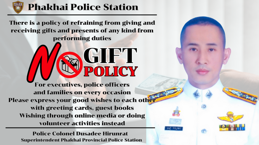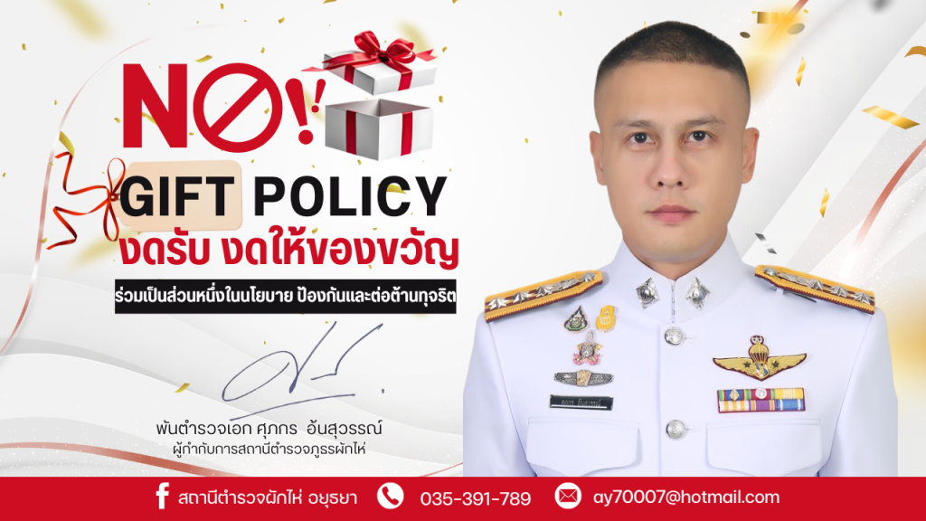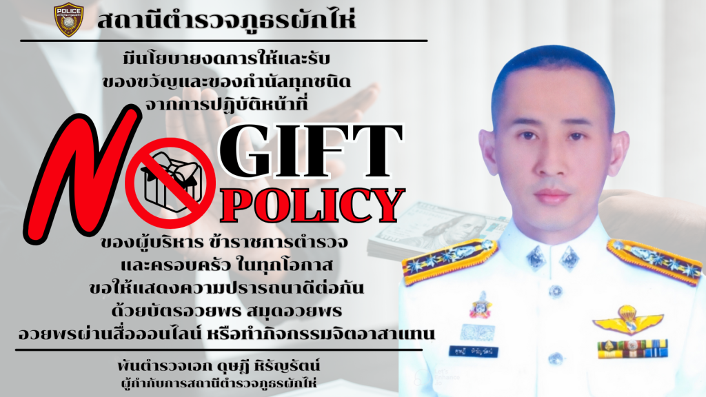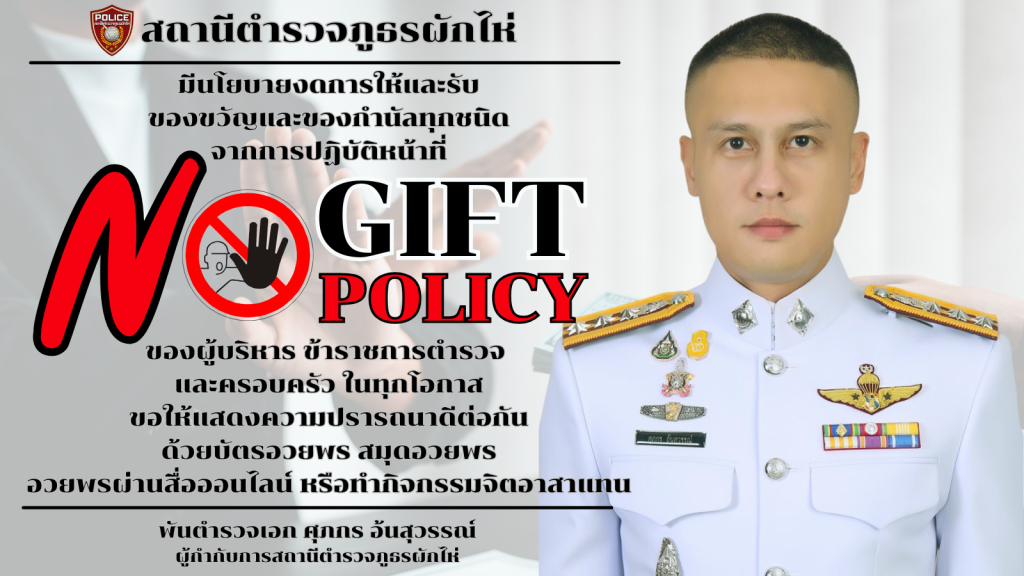 - ประกาศสำนักงานยุทธศาสตร์ตำรวจเรื่องเจตนารมณ์ที่จะไม่รับของขวัญหรือของกำนัลทุกชนิดจากการปฏิบัติหน้าที่