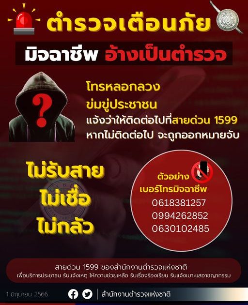 แจ้งว่าให้ติดต่อไปที่เบอร์โทรสายด่วน 1599 ( สายด่วนสำนักงานตำรวจแห่งชาติ ) หากไม่ติดต่อไป จะถูกออกหมายจับ