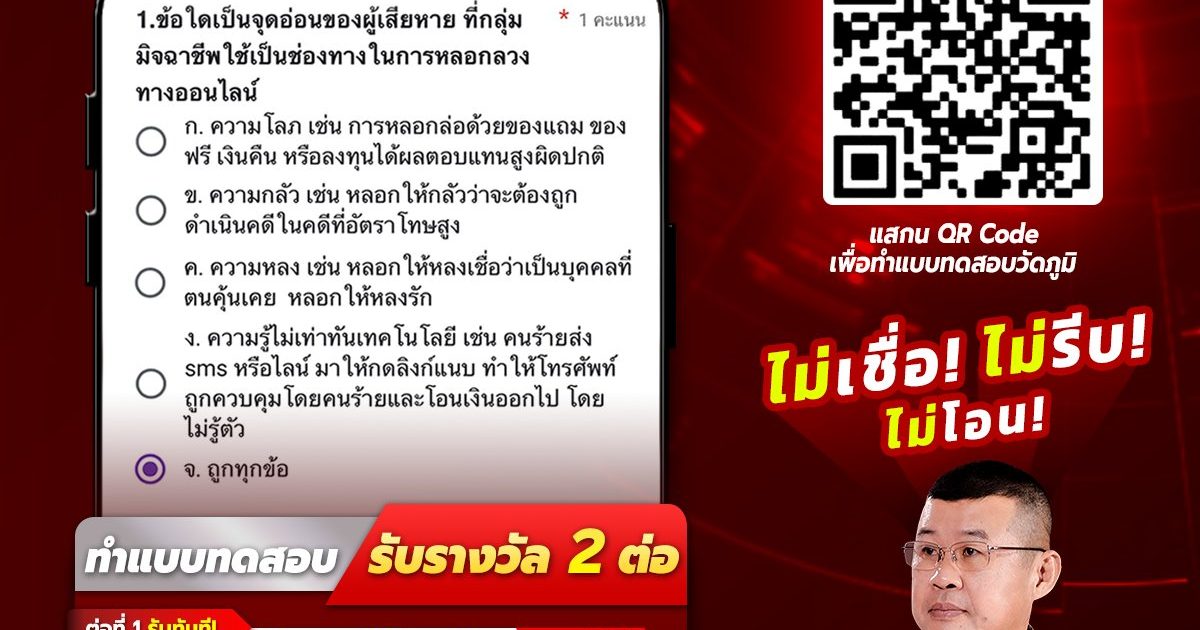 เชิญชวนทำแบบทดสอบวัคซีนไซเบอร์ 40 ข้อ รับรางวัล 2 ต่อ สร้างความรู้ เข้าใจรูปแบบการหลอกลวง ลดความเสี่ยงจากภัยออนไลน์ “ไม่เชื่อ ไม่รีบ ไม่โอน” มีสิทธิลุ้นรับรางวัล