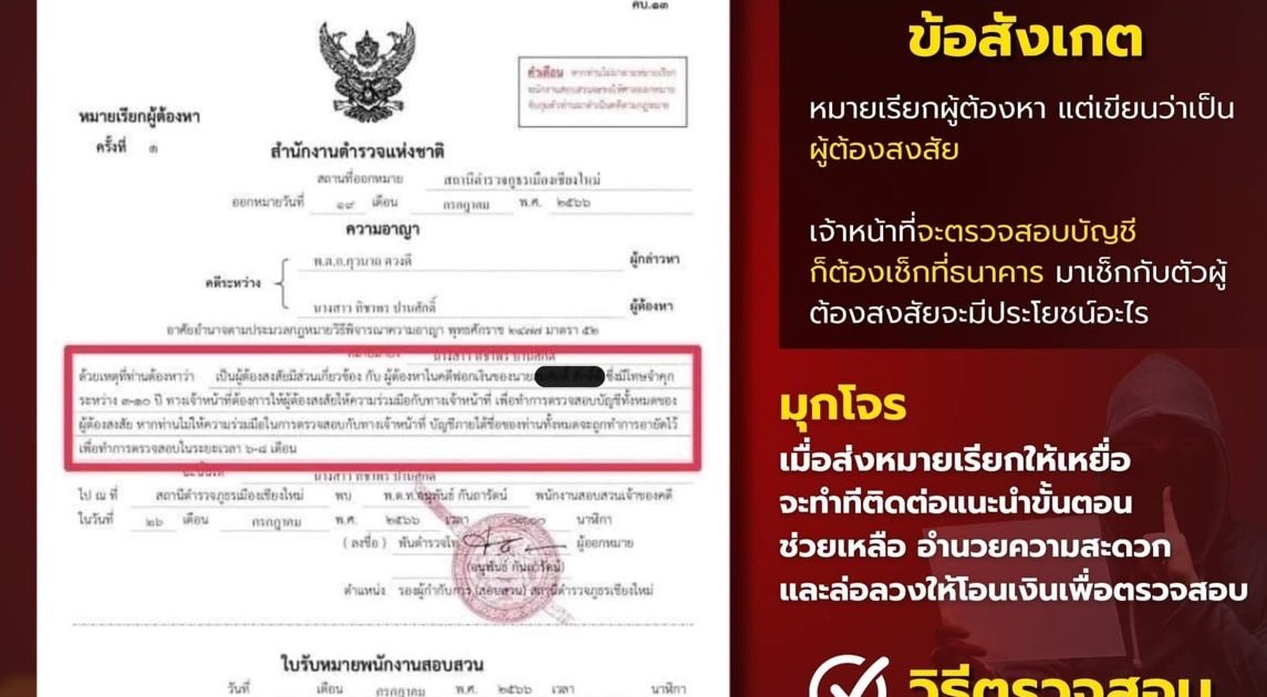 ตัวอย่างหมายเรียกปลอม มิจฉาชีพส่งมาล่อลวงให้ตกใจ อุบายแอบอ้างเป็นเจ้าหน้าที่ฯ หลอกให้โอนเงิน