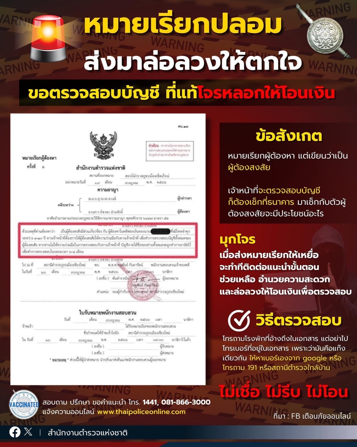 เช็กก่อน .. ตัวอย่างหมายเรียกปลอม มิจฉาชีพส่งมาล่อลวงให้ตกใจ อุบายแอบอ้างเป็นเจ้าหน้าที่ฯ หลอกให้โอน
